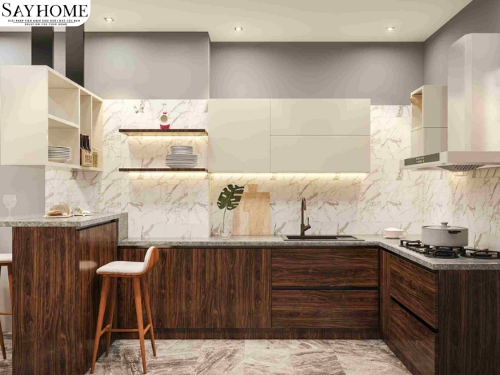 Thẩm mỹ hiện đại – tăng giá trị ngôi nhà: Tủ bếp hiện đại có kiểu dáng đa dạng: chữ I, chữ L, chữ U, tủ bếp có quầy bar, tủ bếp âm tường... Phối hợp vật liệu như gỗ công nghiệp phủ melamine, gỗ tự nhiên sơn PU, nhựa PVC chống nước, mặt bếp ốp đá granite hoặc đá nhân tạo, tạo nên vẻ ngoài sang trọng, đẳng cấp cho không gian bếp.