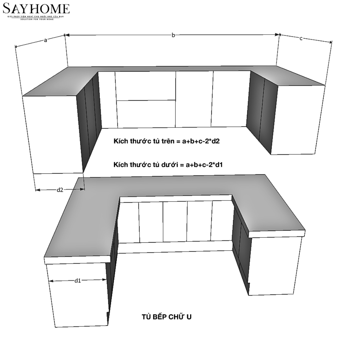 Tổng chiều dài 3 cạnh – 2 × Chiều sâu tủ bếp = Chiều dài tủ bếp chữ U