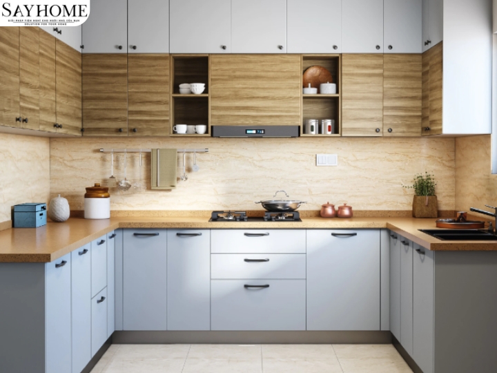 Tủ bếp chữ U là giải pháp cho những gia đình có nhiều thiết bị – dụng cụ nấu ăn nhưng muốn không gian luôn gọn gàng.