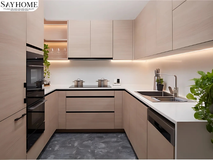 Tủ bếp chữ U là giải pháp cho những gia đình có nhiều thiết bị – dụng cụ nấu ăn nhưng muốn không gian luôn gọn gàng.